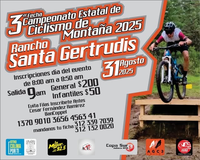 Este domingo a partir de las nueve de la mañana con el arranque de las categorías infantiles se estará desarrollando la Tercer fecha del Campeonato Estatal de Ciclismo de Montaña 2025, correspondiendo la organización a las agrupaciones de JAMA Reacing Team, y AGC3, con la coordinación y el apoyo de la jefatura de deportes del Ayuntamiento que dirige, Andrés García Espitia Ferrer.