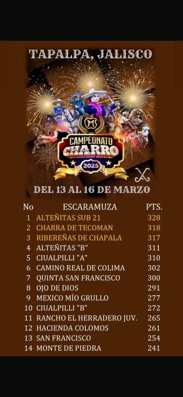 La escaramuza charra de Tecomán subió al podio al obtener el segundo lugar del Campeonato Charro Completo Tapalpa 2025, el evento se realizó la semana pasada, donde las adelitas tecomenses terminaron con 318 puntos, por 328 unidades de las Alteñitas Sub-21, quienes fueron las ganadoras.