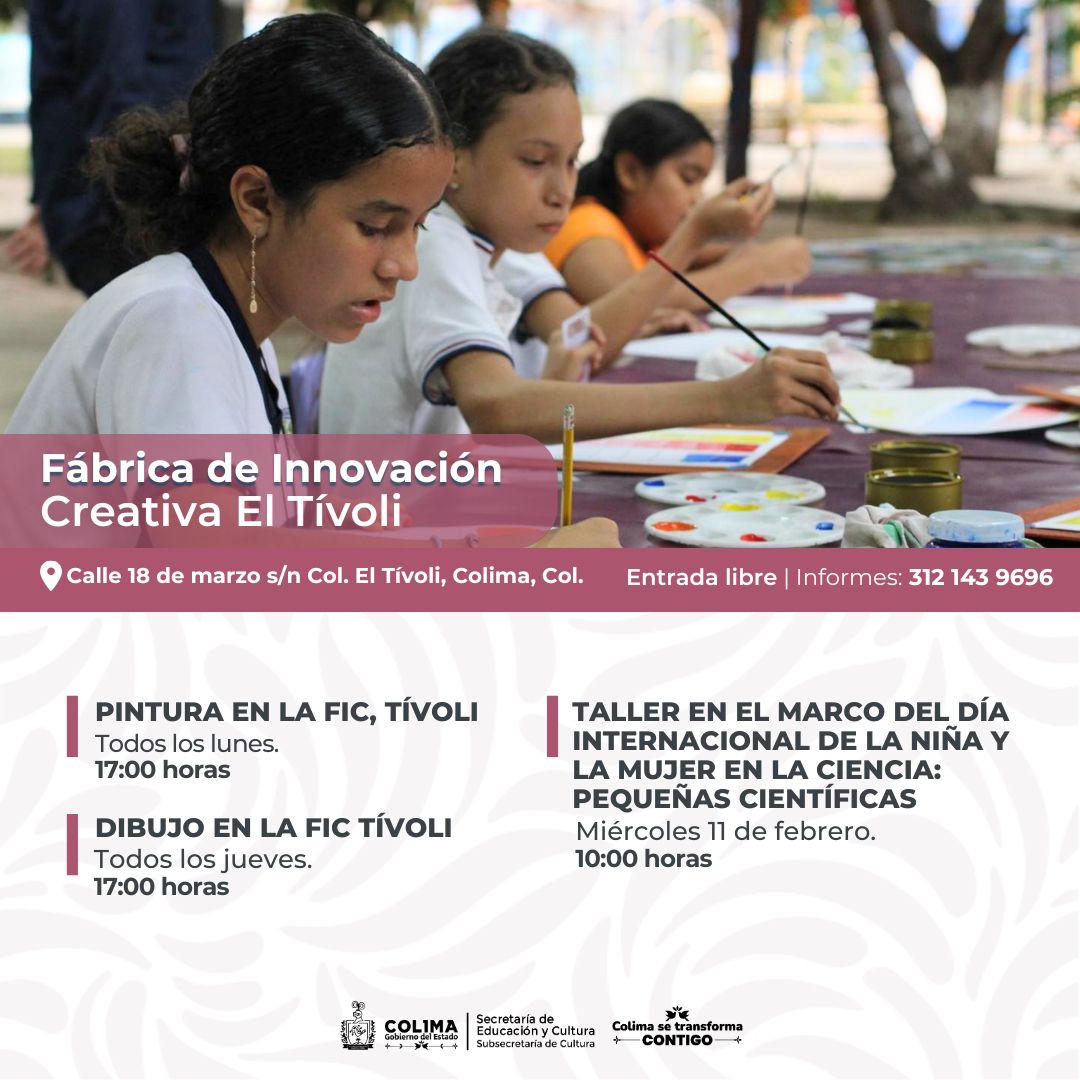 Siguen los talleres gratuitos de lunes a sábado en el Centro Cultural “Julia Piza Miranda” de Manzanillo; el Vagón de las Artes y La Quininita (espacios para las infancias en la Casa de la Cultura Estatal), el Centro Cultural “Balbino Dávalos”, la Biblioteca Pública Central “Rafaela Suárez” y el Centro de Cultura Escrita “Miguel Ángel Cuervo”. La agenda cultural completa puede consultarse en las redes sociales: Cultura Colima en Facebook y cultura.colima en Instagram.