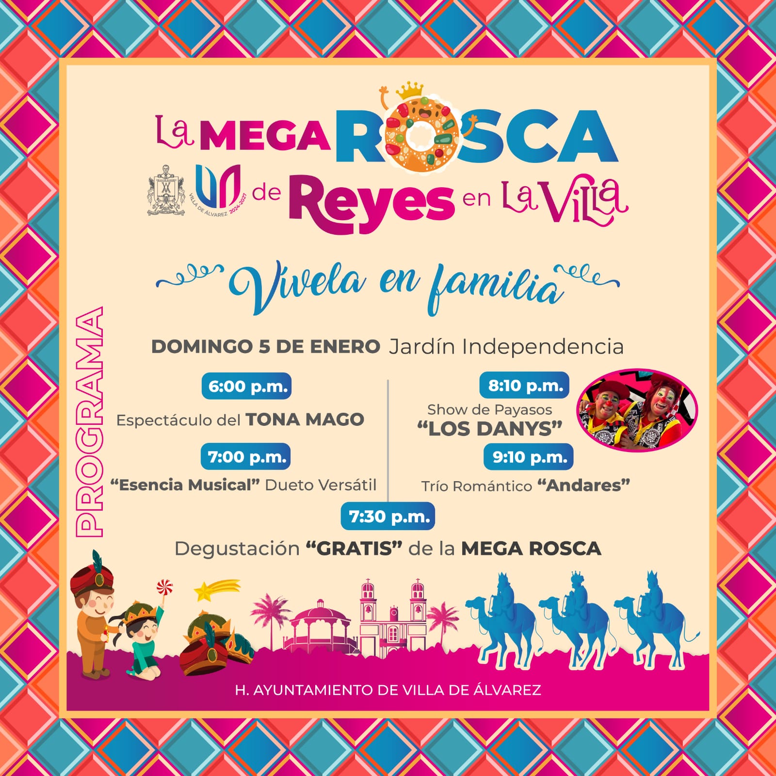 A las 8 de la noche habrá un show de payasos, con Los Danys, y las actividades de la Mega Rosca de Reyes en la Villa concluirán con el Trío Romántico Andares, que iniciará su presentación a partir de la 9:10 de la noche.