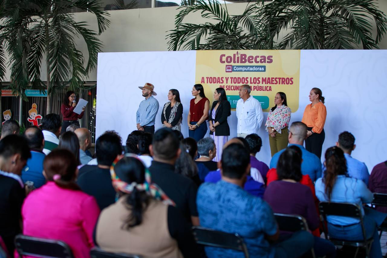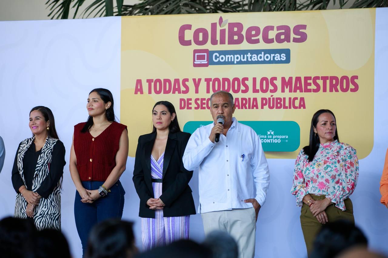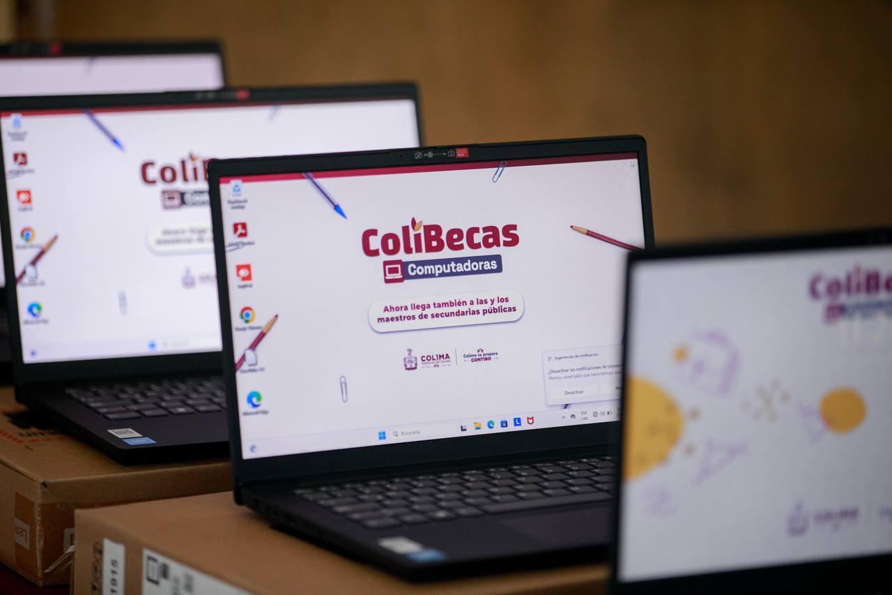 La gobernadora de Colima, Indira Vizcaíno Silva, entregó este jueves laptops gratuitas a 122 docentes de secundaria y 803 estudiantes de secundaria y nivel profesional, a través de ColiBecas Computadoras, que beneficia a más de 16,400 alumnas y alumnos de ambos niveles y a 1,946 maestras y maestros de secundaria, con una inversión global superior a los 158 millones de pesos (mdp).