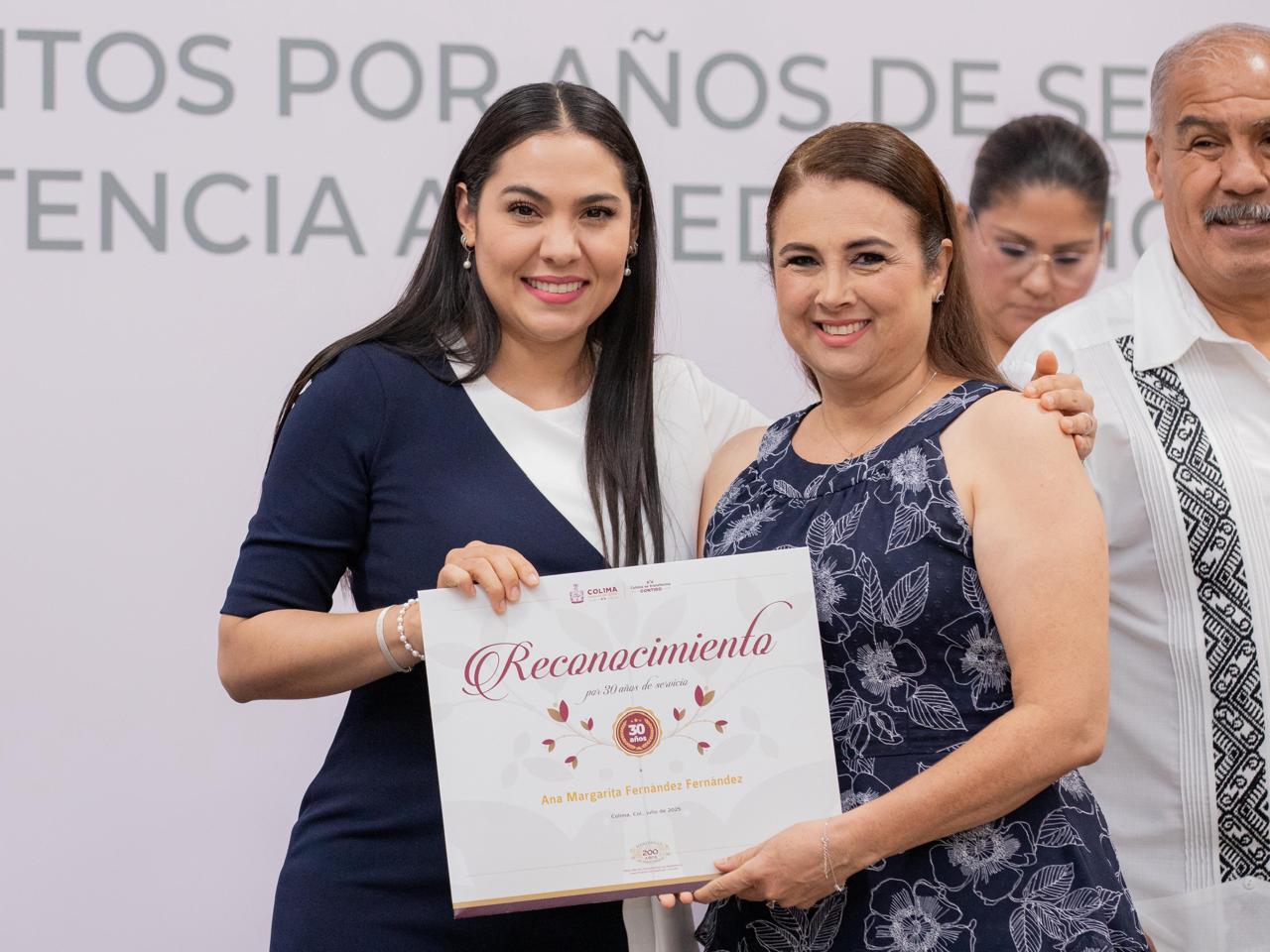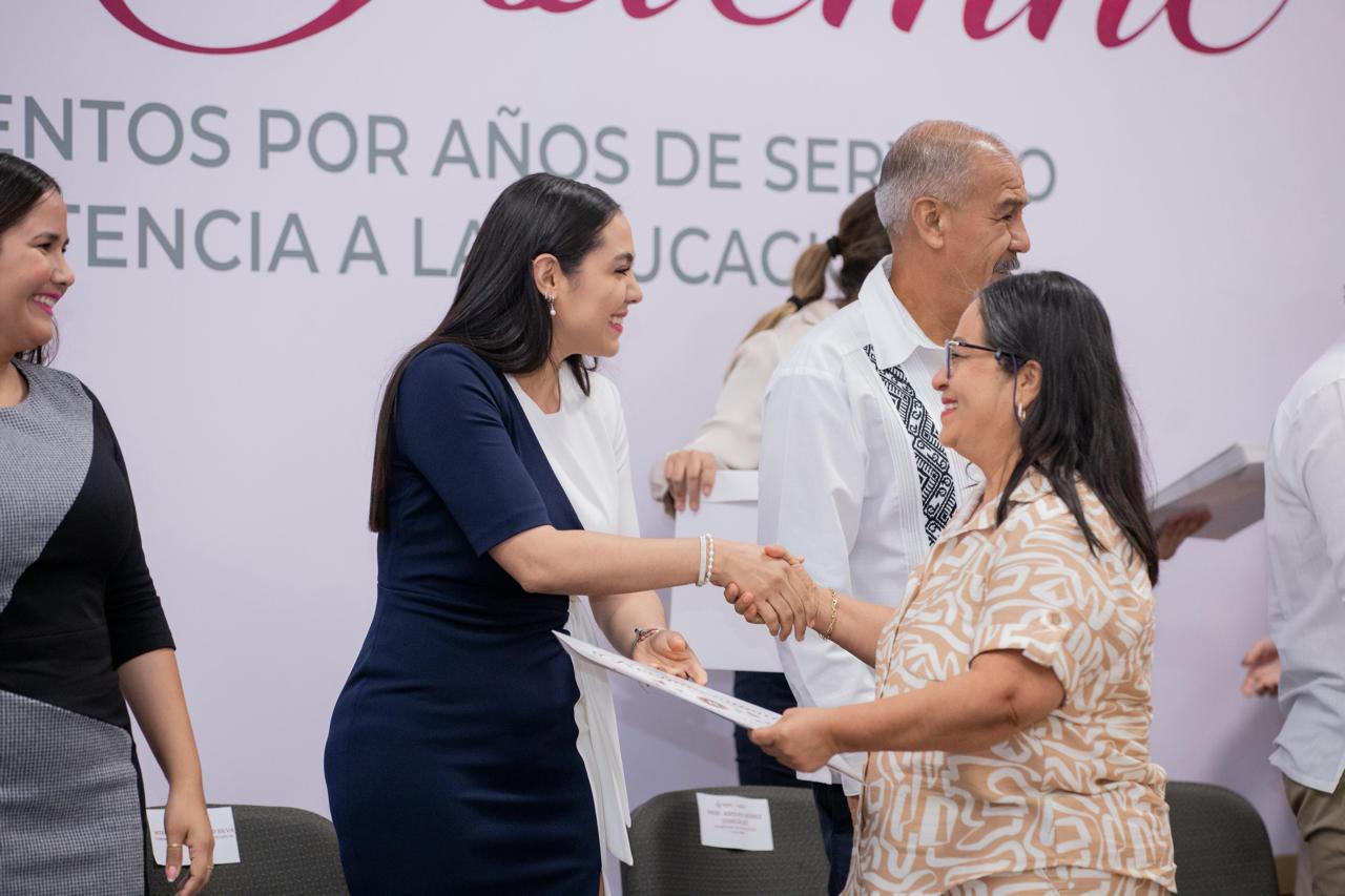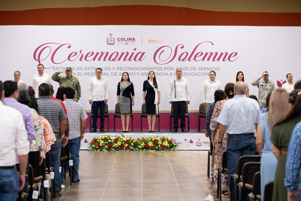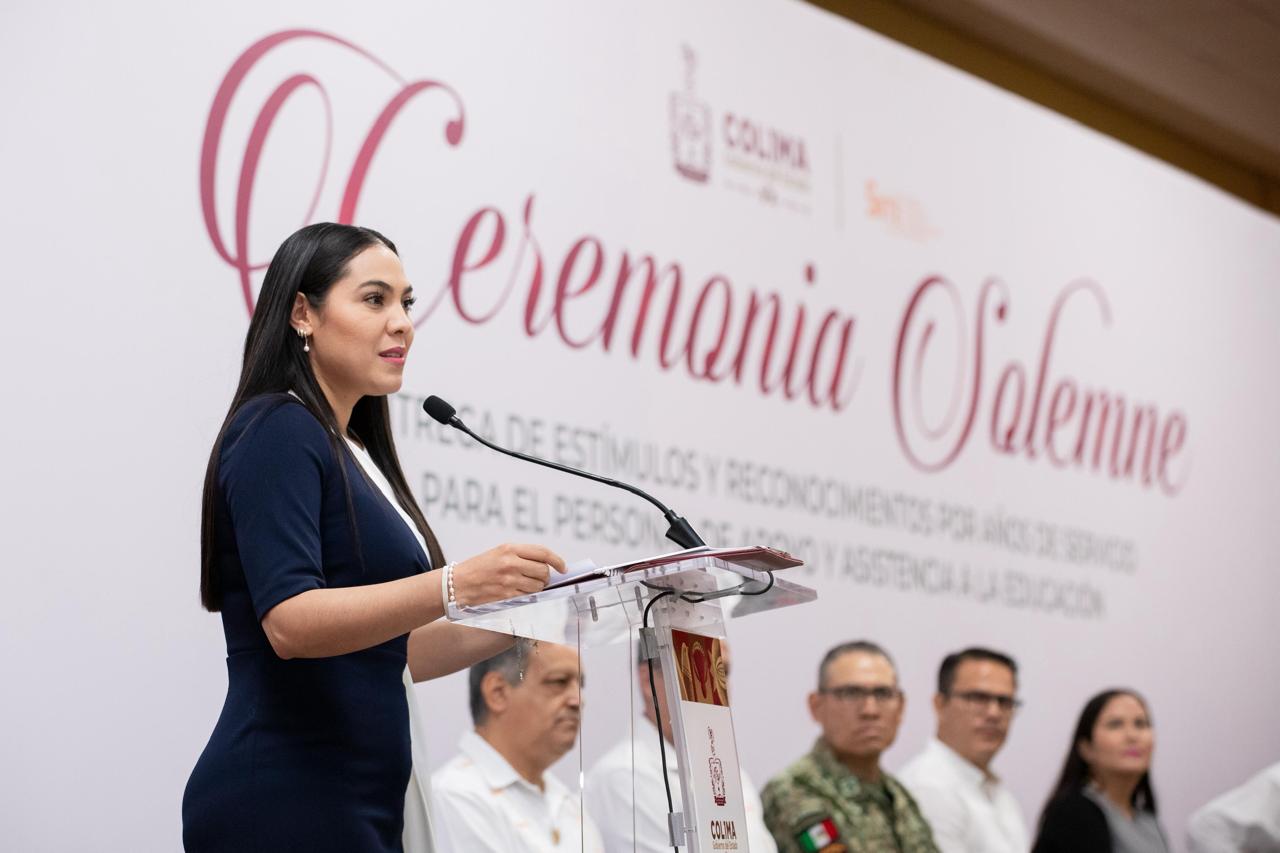 “A nombre del pueblo de Colima y del gobierno que tengo el honor de encabezar, quiero darles las gracias por ese compromiso; por cuidar, atender, acompañar a nuestras infancias, adolescencias y juventudes, hombro a hombro con docentes, con directivos y con autoridades educativas”, expresó la mandataria estatal al personal reconocido por sus años de trabajo.
