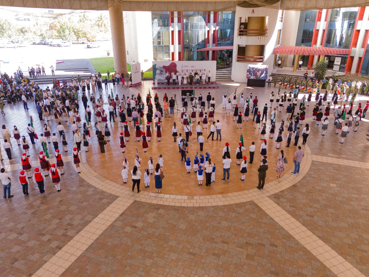 Durante la ceremonia, se realizó un enlace con la ceremonia que a nivel nacional encabezó la presidenta de México, Claudia Sheinbaum Pardo, en el Campo Marte de la capital del país, donde tomó protesta a 920 escoltas de escuelas primarias y secundarias de las 31 entidades federativas del país y de 80 planteles de la Ciudad de México, así como de 56 de las Fuerzas Armadas Mexicanas, quienes asumieron el compromiso de custodiar la enseña nacional.