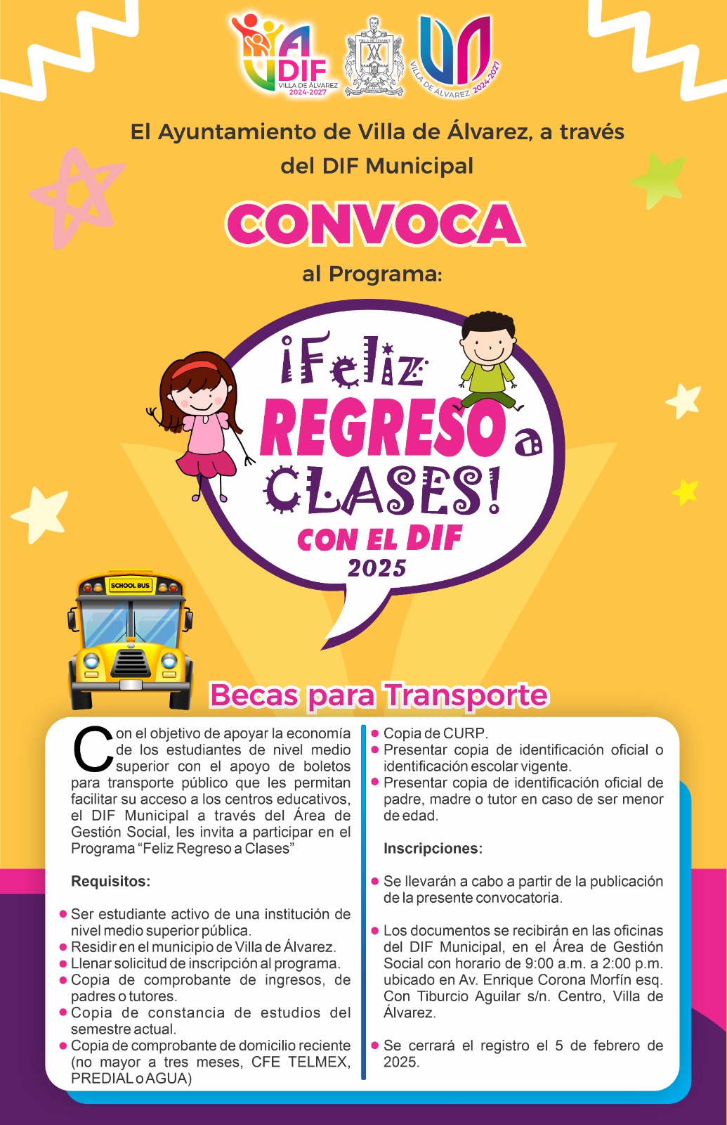 Los interesados en esta beca, que forma parte del programa “Feliz regreso a clases con el DIF 2025”, podrán presentar la documentación requerida para el registro hasta el 5 de febrero, en el área de Gestión Social de las oficinas del DIF Municipal, ubicadas en la esquina de la avenida Enrique Corona Morfín y calle Tiburcio Aguilar, en el Centro de la Villa, en horario de 9:00 de la mañana a 2:00 de la tarde.
