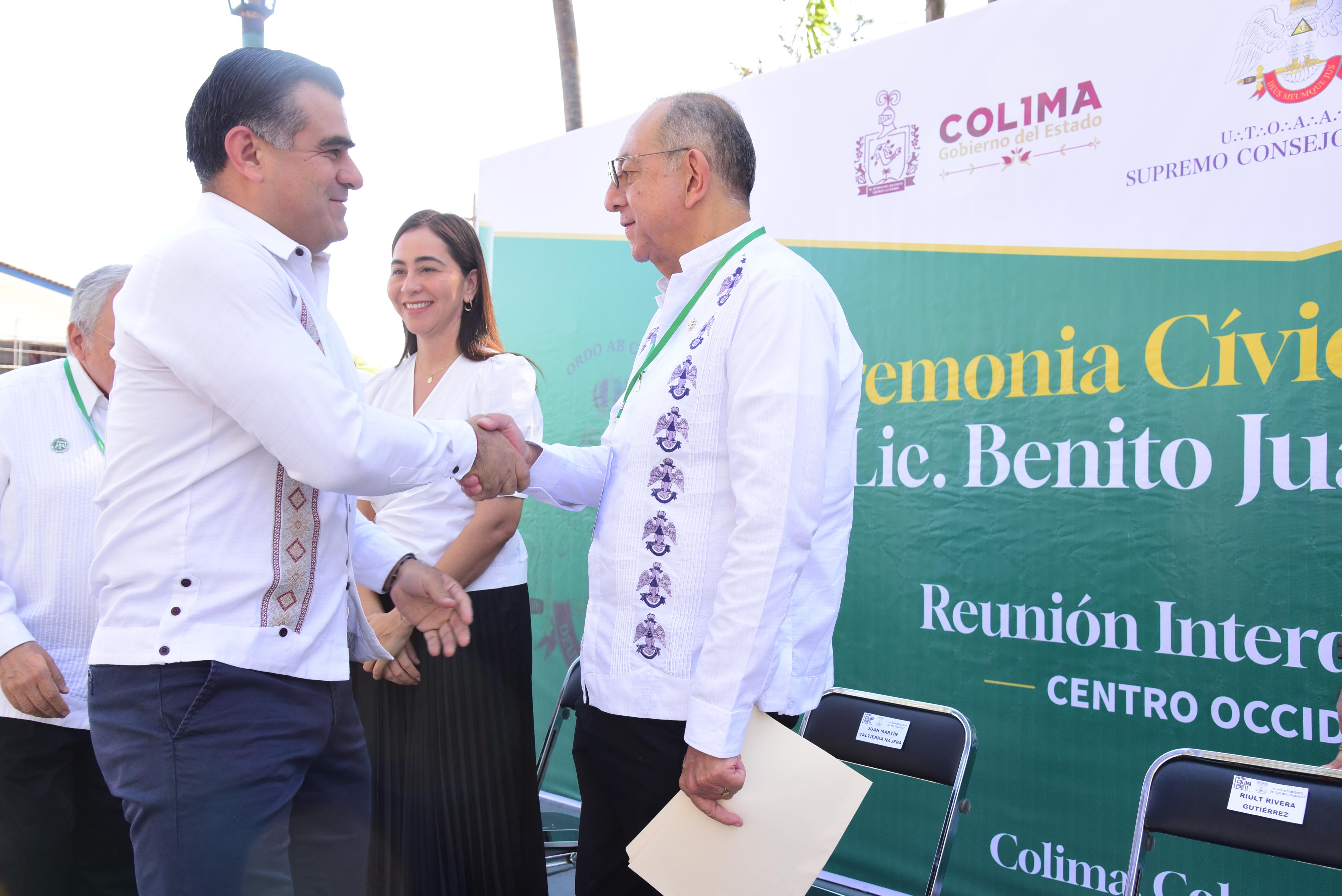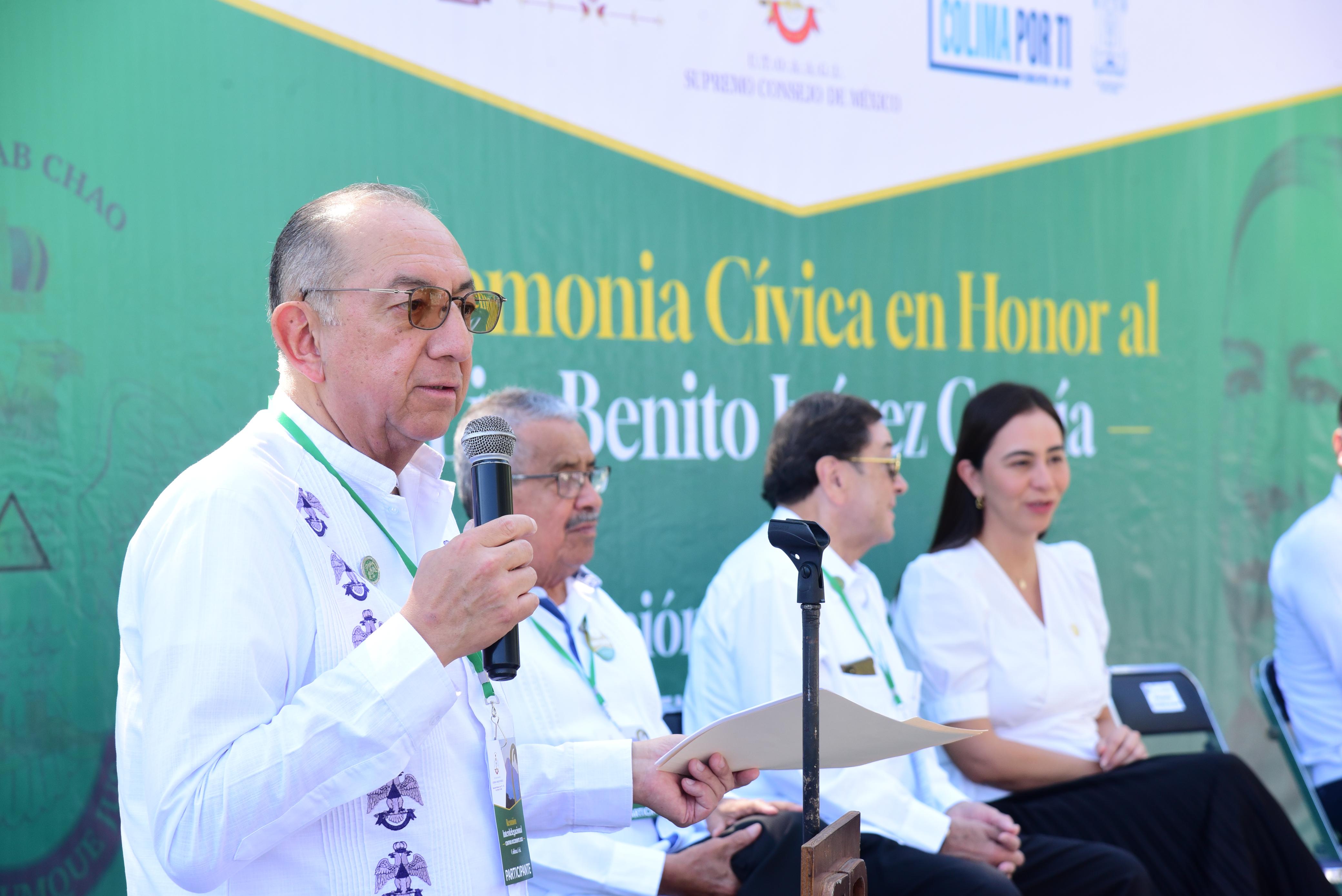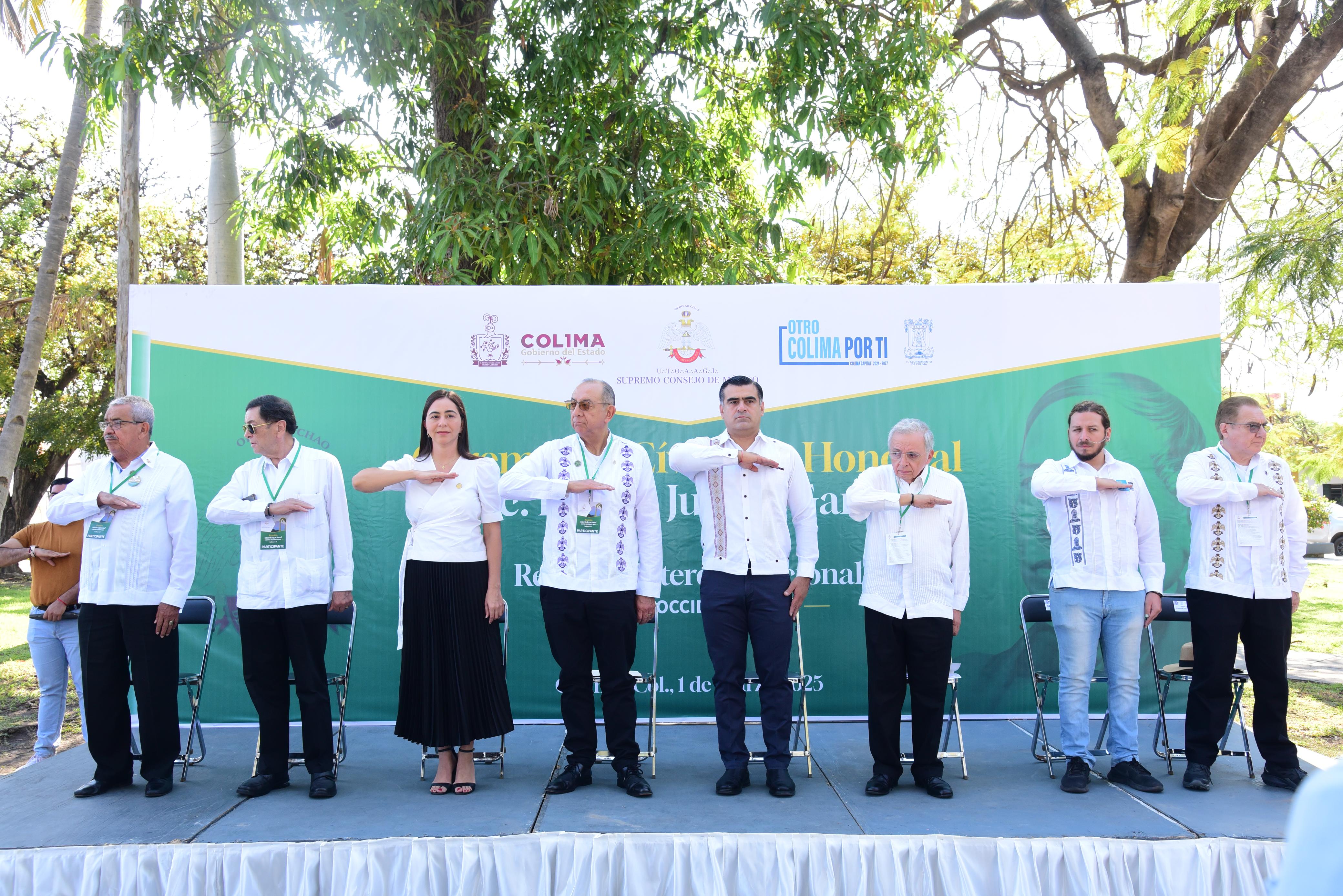 Al participar en la ceremonia cívica en honor a Benito Juárez García, organizada por la Gran Logia Suroeste, como parte de la Reunión Interdelegacional Centro Occidente 2025, en donde están participando 16 delegaciones que se encuentran presentes en la ciudad de Colima, el edil capitalino dijo que en la Presidencia de la República itinerante, Juárez estuvo en estas hermosas tierras y también pernoctó entre los colimenses en donde sembró la semilla de la democracia.